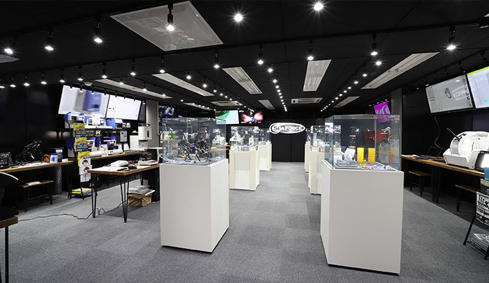 約70坪の広いスペースをフル活用した中型店舗です。工具の販売から最新機器のショールームまで東京本社に負けない品揃えを目指してます。最新の3Dプリンターや最新機器から工具まで展示販売する予定です。