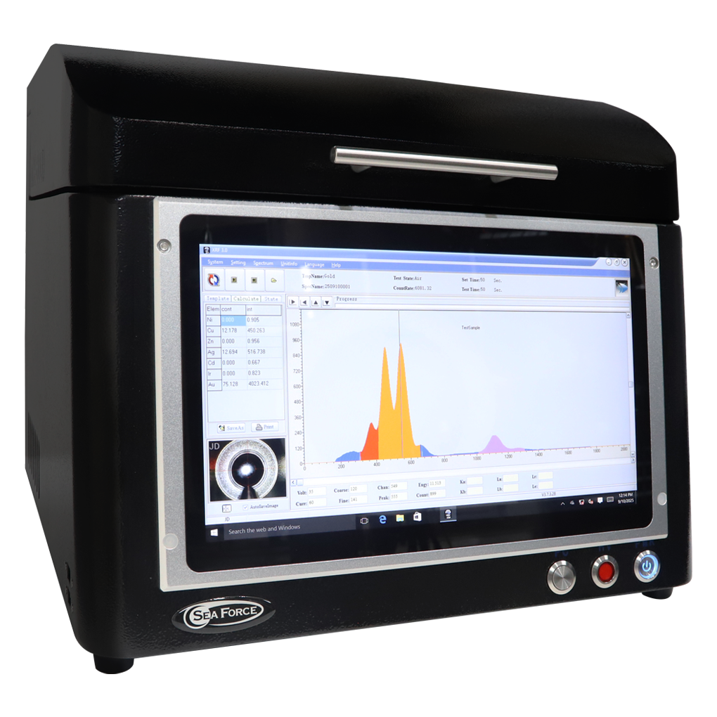 貴金属の計測を目的としたエコノミー分析器です。PC内蔵型のタッチパネル対応で、操作も簡単。対象物を設置し、ソフトウェア上の分析ボタンを押すだけで計測することができます。