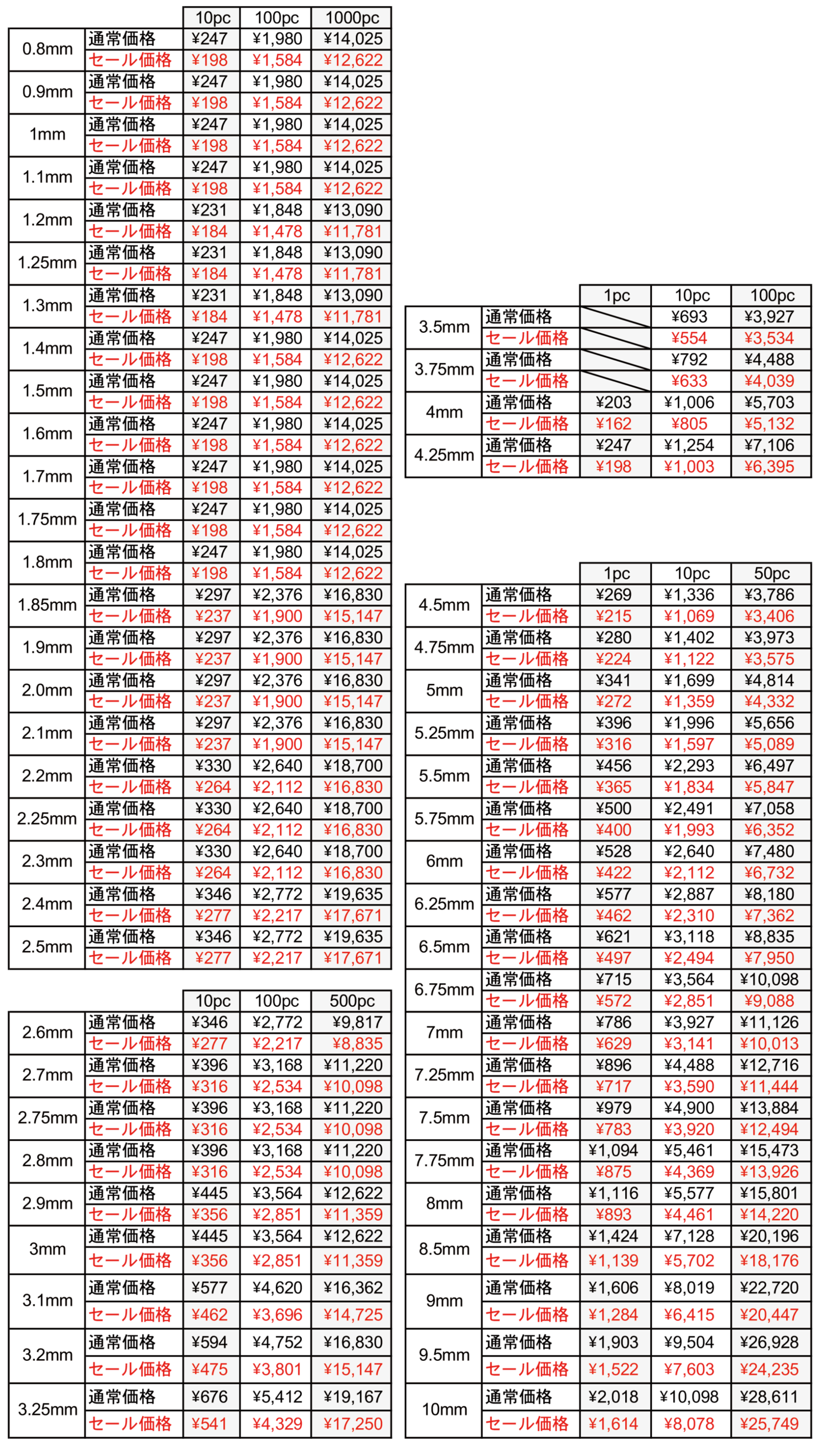 < 価格表(税込) >